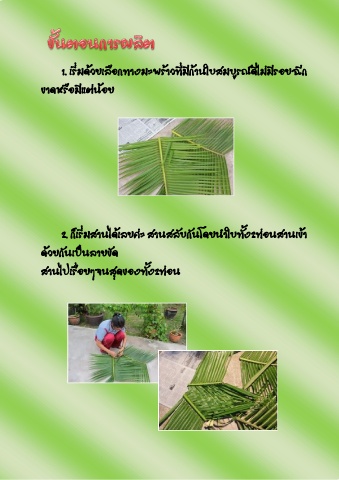 1. เริ่มด้วยเลือกทางมะพร้าวที่มีก้านใบสมบูรณ์ดีไม่มีรอยฉีก ขาดหรือมีแต่น้อย 2. ก็เริ่มสานได้เลยค่ะ สานสลับกันโดยน าใบทั้ง2ท่อนสานเข้า ด้วยกันเป็นลายขัด สานไปเรื่อยๆจนสุดของทั้ง2ท่อน