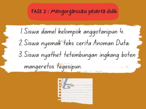 FASE 2 : Mengorganisasi peserta didik 1. Siswa damel kelompok anggotanipun 4. 2. Siswa nyemak teks cerita Anoman Duta. 3. Siswa nyathet tetembungan ingkang boten mangeretos tegesipun.