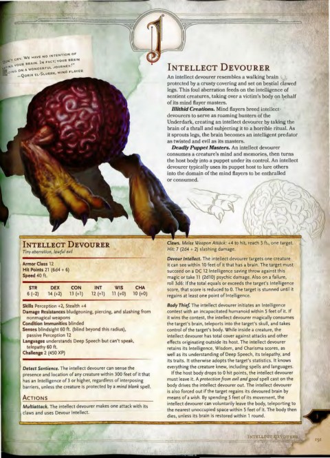 Skills Perception +2, Stealth +4 Body Thief. The intellect devourer initiates an Intelligence