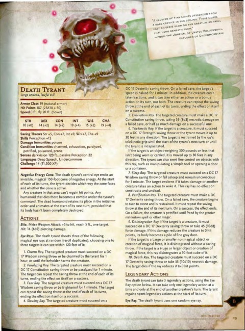 17 Wisdom saving throw or be charmed by the tyrant for 1 10. Death Ray. The targeted creature must succeed on a DC