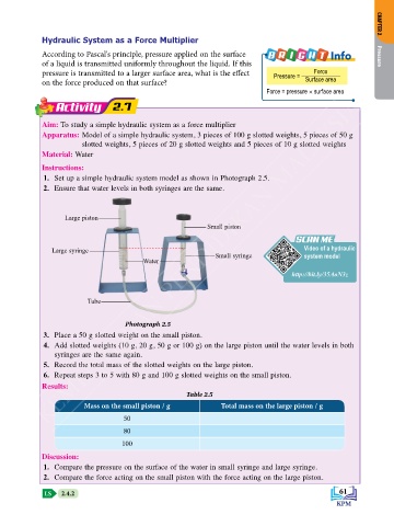 Apparatus: Model of a simple hydraulic system, 3 pieces of 100 g slotted weights, 5 pieces of 50 g