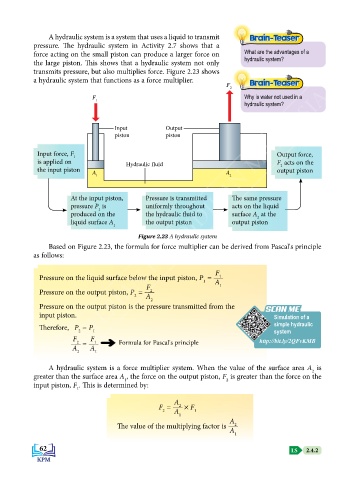 transmits pressure, but also multiplies force. Figure 2.23 shows