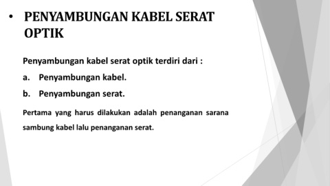 • PENYAMBUNGAN KABEL SERAT OPTIK Penyambungan kabel serat optik terdiri dari : a. Penyambungan kabel. b. Penyambungan serat. Pertama yang harus dilakukan adalah penanganan sarana sambung kabel lalu penanganan serat.