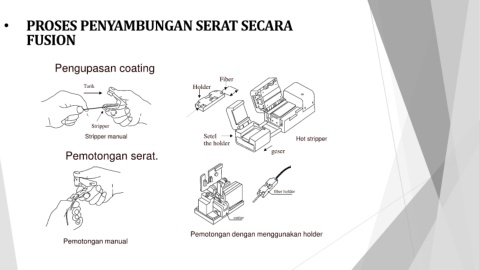 • PROSES PENYAMBUNGAN SERAT SECARA FUSION Pengupasan coating Fiber Tarik Holder Stripper Stripper manual Setel Hot stripper the holder Pemotongan serat. geser fiber holder cutter Pemotongan dengan menggunakan holder Pemotongan manual