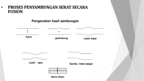 • PROSES PENYAMBUNGAN SERAT SECARA FUSION Pengecekan hasil sambungan Garis gelembung Lebih tebal Lebih tipis Sumbu tidak sejajar Garis hitam