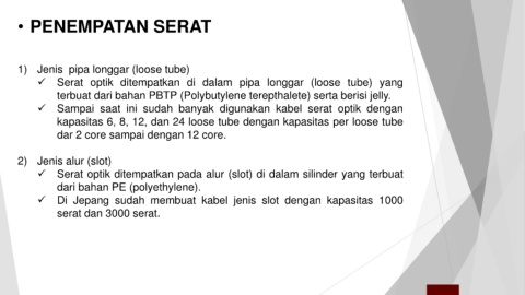 ✓ Serat optik ditempatkan pada alur (slot) di dalam silinder yang terbuat