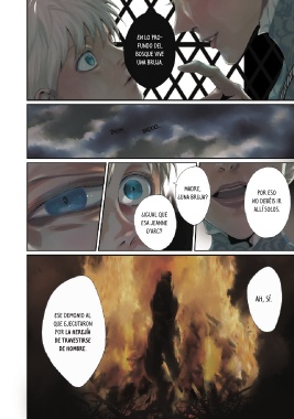 En lo pro- fundo del bosque vive una bruja. BROM BROOO... Madre, Por eso ¿una bruja? no debéis ir allí solos. ¿Igual que esa Jeanne d’Arc? Ah, sí. Ese demonio al que ejecutaron por la herejía de travestirse de hombre.