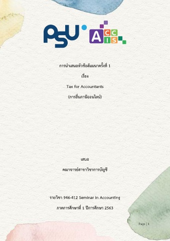 การนำเสนอหัวข้อสัมมนาครั้งที่ 1 เรื่อง Tax for Accountants (การยื่นภาษีออนไลน์) เสนอ คณาจารย์สาขาวิชาการบัญชี รายวิชา 946-412 Seminar in Accounting ภาคการศึกษาที่ 1 ปีการศึกษา 2563 Page | 1