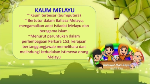 ~ Kaum terbesar (bumiputera) ~ Bertutur dalam Bahasa Melayu, mengamalkan adat istiadat Melayu dan beragama islam. ~Menurut peruntukan dalam perlembagaan Perkara 153, kerajaan bertanggungjawab memelihara dan melindungi kedudukan istimewa orang Melayu