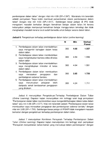 Jadual 6 menunjukkan Pengetahuan Terhadap Pembelajaran Dalam Talian