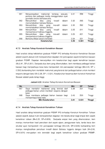 Jadual 4.22: Analisis Tahap Konstruk Kemahiran Bacaan