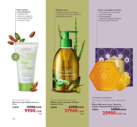 "Orzu kremi" qo'l kremi "Zaytun va aloe" suyuq qo'l sovuni "Sut va asal - Oltin seriya" sovuni. Bayramona «Muhabbat alangalari» sovuni Dush uchun mochalka "Bahor guldastasi" dush "Bahor guldastasi" sovuni