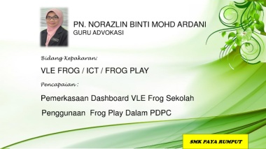 PN. NORAZLIN BINTI MOHD ARDANI GURU ADVOKASI Bidang Kepakaran: VLE FROG / ICT / FROG PLAY Pencapaian : Pemerkasaan Dashboard VLE Frog Sekolah Penggunaan Frog Play Dalam PDPC SMK PAYA RUMPUT