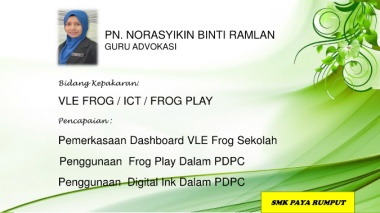PN. NORASYIKIN BINTI RAMLAN GURU ADVOKASI Bidang Kepakaran: VLE FROG / ICT / FROG PLAY Pencapaian : Pemerkasaan Dashboard VLE Frog Sekolah Penggunaan Frog Play Dalam PDPC Penggunaan Digital Ink Dalam PDPC SMK PAYA RUMPUT