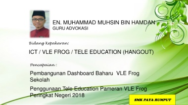 EN. MUHAMMAD MUHSIN BIN HAMDAN GURU ADVOKASI Bidang Kepakaran: ICT / VLE FROG / TELE EDUCATION (HANGOUT) Pencapaian : Pembangunan Dashboard Baharu VLE Frog Sekolah Penggunaan Tele Education Pameran VLE Frog Peringkat Negeri 2018 SMK PAYA RUMPUT