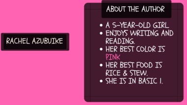 ABOUT THE AUTHOR A 5-YEAR-OLD GIRL. ENJOYS WRITING AND RACHEL AZUBUIKE READING. HER BEST COLOR IS PINK HER BEST FOOD IS RICE & STEW. SHE IS IN BASIC 1.