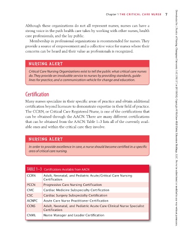 can be obtained through the AACN. There are many different certifications Downloaded by [ Faculty of Nursing, Chiangmai University 5.62.158.117] at [07/18/16]. Copyright © McGraw-Hill Global Education Holdings, LLC. Not to be redistributed or modified in any way without permission.