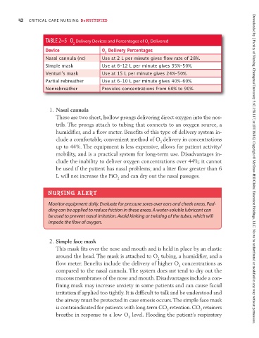 be used if the patient has nasal problems; and a liter flow greater than 6 Downloaded by [ Faculty of Nursing, Chiangmai University 5.62.158.117] at [07/18/16]. Copyright © McGraw-Hill Global Education Holdings, LLC. Not to be redistributed or modified in any way without permission.