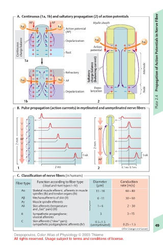 A. Continuous (1a, 1b) and saltatory propagation (2) of action potentials