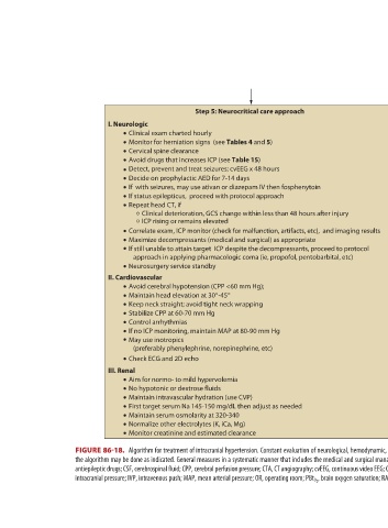 Clinical exam charted hourly Monitor for herniation signs (see Tables 4 and 5) Cervical spine clearance Avoid drugs that increases ICP (see Table 15) Detect, prevent and treat seizures; cvEEG x 48 hours Decide on prophylactic AED for 7-14 days If status epilepticus, proceed with protocol approach Repeat head CT, if ICP rising or remains elevated Neurosurgery service standby Avoid cerebral hypotension (CPP <60 mm Hg); Maintain head elevation at 30°-45° Keep neck straight; avoid tight neck wrapping Stabilize CPP at 60-70 mm Hg Control arrhythmias If no ICP monitoring, maintain MAP at 80-90 mm Hg
