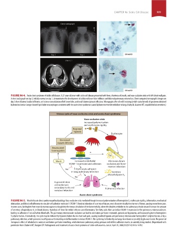 FIGURE 96-5. Model of acute chest syndrome pathophysiology. Vaso-occlusive crisis mediated though increased polymerization of hemoglobin S, erythrocyte rigidity, deformation, mechanical