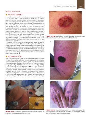 FIGURE 129-37. Disseminated aspergillosis: a well-defined, necrotic plaque on the surrounding erythema on the anterior arm (A), and multiple small necrotic papules on dorsal
