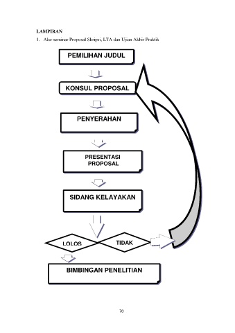 LAMPIRAN 1. Alur seminar Proposal Skripsi, LTA dan Ujian Akhir Praktik PEMILIHAN JUDUL KONSUL PROPOSAL PENYERAHAN PROPOSAL PRESENTASI PROPOSAL SIDANG KELAYAKAN LOLOS TIDAK BIMBINGAN PENELITIAN 70