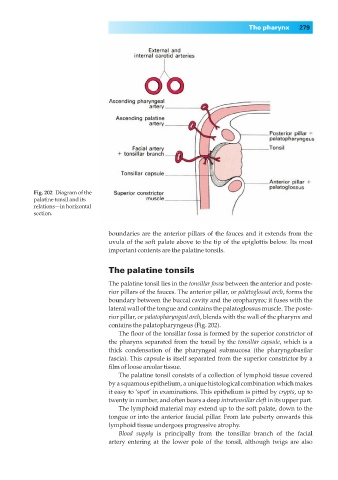 The palatine tonsil lies in the tonsillar fossa between the anterior and poste-