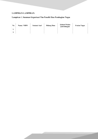 LAMPIRAN-LAMPIRAN: Lampiran 1. Susunan Organisasi Tim Peneliti Dan Pembagian Tugas No Nama / NIDN Instansi Asal Bidang Ilmu Alokasi Waktu Uraian Tugas (jam/minggu) 1. 2.