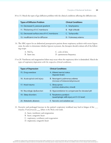 10 to 13. Match the types of gas diffusion problem with the clinical conditions affecting the diffusion rate.