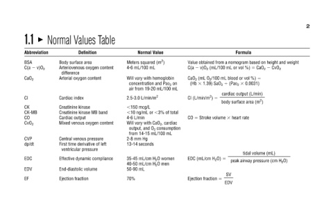 Normal Values Table Definition Body surface area Arteriovenous oxygen content difference Arterial oxygen content Cardiac index Creatinine kinase Creatinine kinase MB band Cardiac output Mixed venous oxygen content Central venous pressure First