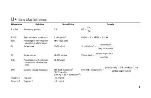 Normal Values Table (continued) Definition Respiratory quotient Right ventricular stroke work Percentage of oxyhemoglobin saturation of arterial blood Stroke index Stroke volume Percentage of oxyhemoglobin saturation of mixed venous blood