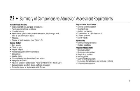 Medical conditions, surgical procedures Psychiatric/emotional problems Medications (prescription, over-the-counter, illicit drugs) and time of last medication dose Review of body systems (see Table 1-7) Highest educational level completed P
