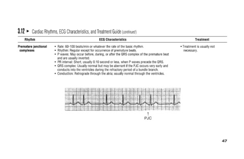 ECG Characteristics P waves: May occur before, during, or after the QRS complex of the premature beat PR interval: Short, usually 0.10 second or less, when P waves precede the QRS. QRS complex: Usually normal but may be aberrant if the PJC occurs