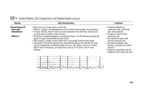 ECG Characteristics Rhythm: Irregular. Overall appearance of the rhythm demonstrates “group beating.” P waves: Normal. Some P waves are not conducted to the ventricles, but only one PR interval: Gradually lengthens in consecutive beats. The PR i