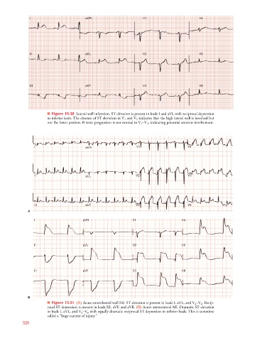 ■ Figure 15-31 (A) Acute anterolateral wall MI. ST elevation is present in leads I, aVL, and V 2 –V 6 . Recip-