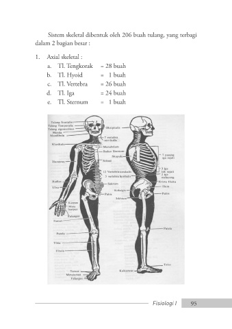 Sistem skeletal dibentuk oleh 206 buah tulang, yang terbagi dalam 2 bagian besar : 1. Axial skeletal : a. Tl. Tengkorak = 28 buah b. Tl. Hyoid = 1 buah c. Tl. Vertebra = 26 buah d. Tl. Iga = 24 buah e. Tl. Sternum = 1 buah Fisiologi I 95