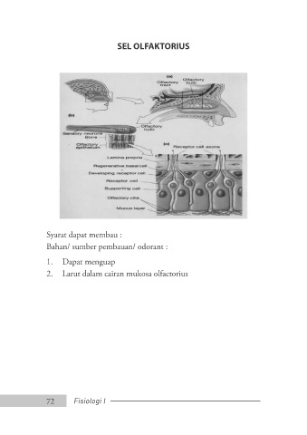 SEL OLFAKTORIUS Syarat dapat membau : Bahan/ sumber pembauan/ odorant : 1. Dapat menguap 2. Larut dalam cairan mukosa olfactorius 72 Fisiologi I