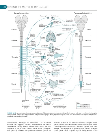 FIGURE 16.12 Sympathetic and parasympathetic divisions of the autonomic nervous system. Sympathetic outputs (left) arise from thoracolumbar spinal