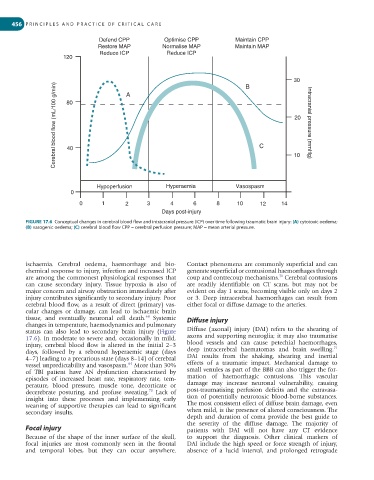 FIGURE 17.6 Conceptual changes in cerebral blood flow and intracranial pressure (ICP) over time following traumatic brain injury: (A) cytotoxic oedema;