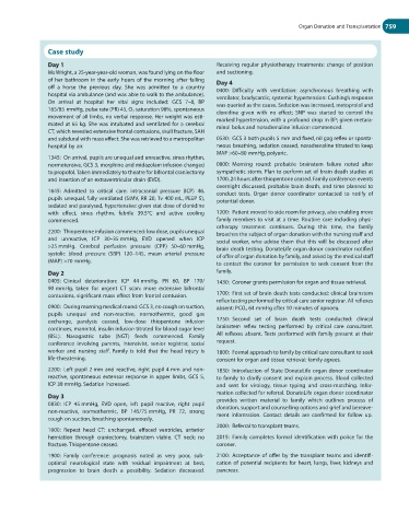 0405: Clinical deterioration: ICP 44 mmHg, PR 60, BP 170/ 1430: Coroner grants permission for organ and tissue retrieval.