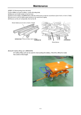 [3] Place the EV battery cart(MB992353) under the vehicle and put the two wood blocks (size 4 inch x 4 inch x 5 feet).
