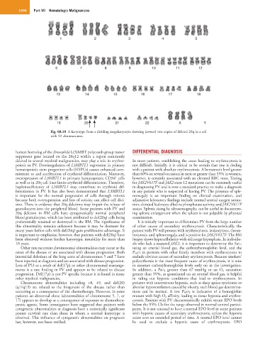Fig. 68.10 A karyotype from a dividing megakaryocyte showing (arrows) two copies of deleted 20q in a cell