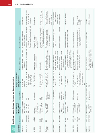 Principal Associated Blood Group Antigens (null phenotype) A, B, AB, A1 (group O) M, N, S, s, U, Vw; M k M k lack GPA and GPB; En(a−) lack GPA; S−s−U− lack GPB P1, Pk (P1−, PP1Pk−) D, C, E, c, e, G, V/VS (Rh null syndrome) Lu a , Lu b , Lu3, Au a , Au b (recessive Lu(a−b−)) K, k, Kp a , Kp b , Ku, Js a , Js b (K 0 or K null ) Le a , Le b , Le ab , Le bh , ALe b , BLe b (Le(a−b−)) Fy a , Fy b , Fy3, Fy6 (Fy(a−b−)) Jk a , Jk b , J