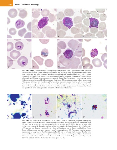 Fig. 158.5, cont’d Plasmodium ovale: Intraerythrocytic ring forms (I) have a prominent nucleus. The older