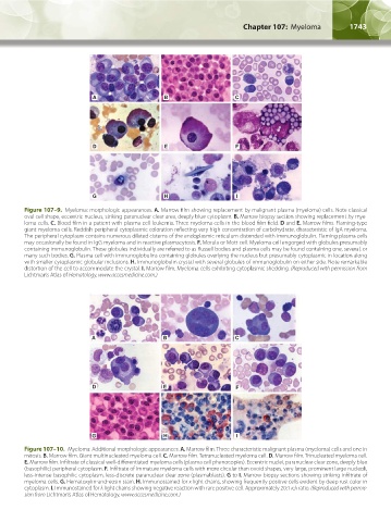 Figure 107–10. Myeloma: Additional morphologic appearances. A. Marrow film. Three characteristic malignant plasma (myeloma) cells and one in