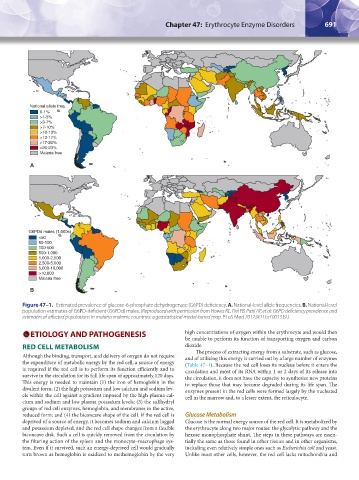 Figure 47–1. Estimated prevalence of glucose-6-phosphate dehydrogenase (G6PD) deficiency. A. National-level allele frequencies. B. National-level