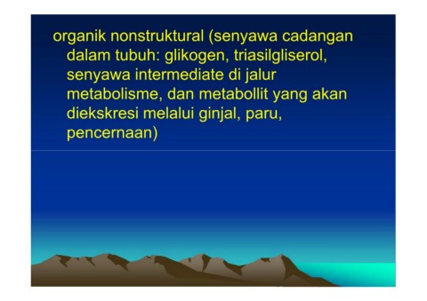 organik nonstruktural (senyawa cadangan dalam tubuh: glikogen, triasilgliserol, senyawa intermediate di jalur metabolisme, dan metabollit yang akan diekskresi melalui ginjal, paru, pencernaan)