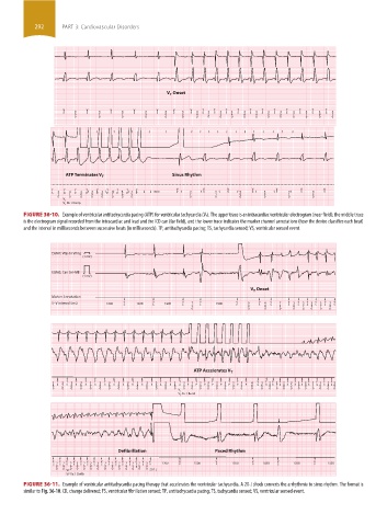FIGURE 36-11. Example of ventricular antitachycardia pacing therapy that accelerates the ventricular tachycardia. A 20-J shock converts the arrhythmia to sinus rhythm. The format is