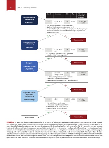 FIGURE 46-1. Example of an algorithm to guide decisions to deflate the tracheostomy cuff and to proceed toward tracheostomy decannulation. Legend: Cough, score on subjective cough scale
